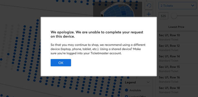 If something fails in your app, at least have the courtesy to tell your users why, @Ticketmaster. Greying out the "Next" button without any explanation is a road to frustration.