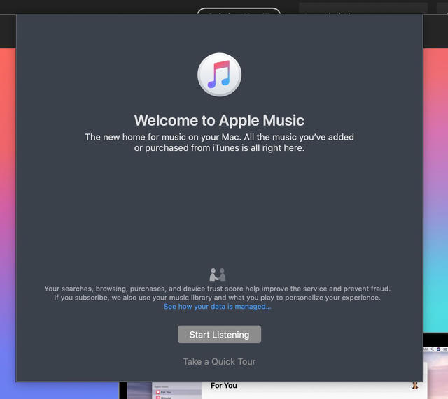 God forbid you accidentally open Apple Music and get confronted with the most annoying pop-up dialog with only choices: "Start Listening" or "Take a Quick Tour". Top left X is grayed out.