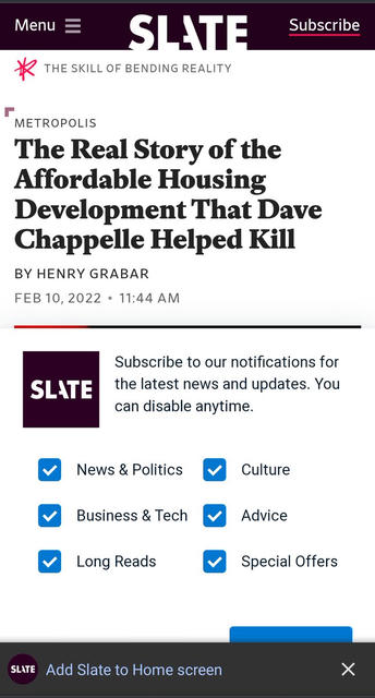Fuck your notifications, pre-checked boxes and your "Add to home screen" widget. Seriously. If your content is engaging users will subscribe to you. This just ensures they will never return, @slate.